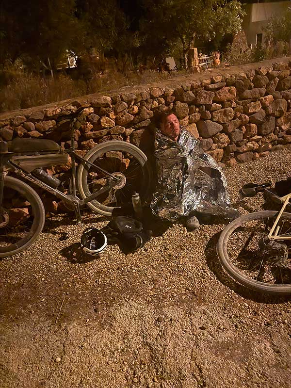 The heat hit hard. The landscape turned orange and dry, and shade was rare. We ran out of gears, walked the steepest parts, and finally collapsed under a small olive tree just to cooldown. Other riders stopped to check on us. Small moments of kindness that mean everything when you’re deep in the wild.