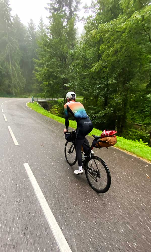 Regarding the bike we both rode a normal road bike but with wider tires. The Vittoria Rubino pro TLR 30mm and the Vittoria Corsa N.EXT TLR 30mm. These tires were mounted on the FFWD DRIFT and the FFWD TYRO. Due to the wider rims and tires we had more comfort. This becomes more important when adding additional weight on the bike with all the bags. The tires were also made tubeless which makes the riding experience a lot better. This wheel-tire combination ensured that we did not have a single flat tire during the 1100km ride. In terms of gears we were both running 53/36 in the front and 11/30 in the rear. Before the start of a bikepacking trip it is useful to check if everything is still good to use; such as your brake pads, chain, cassette and chainrings. Our bike including luggage weighed 20kg.